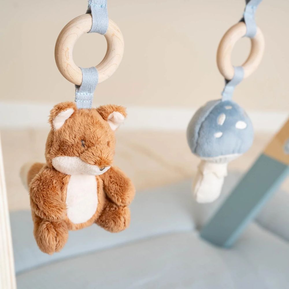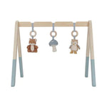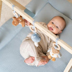 Up with those little arms! Curious babies will have a great time with this wooden baby gym. There are three different activity toys. The baby gym develops hand-eye coordination, improves motor skills, and stimulates the senses every time your little one reaches for one of the toys.