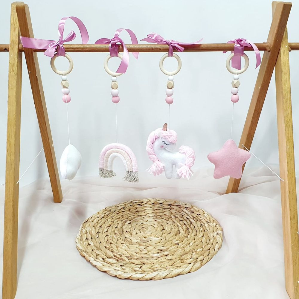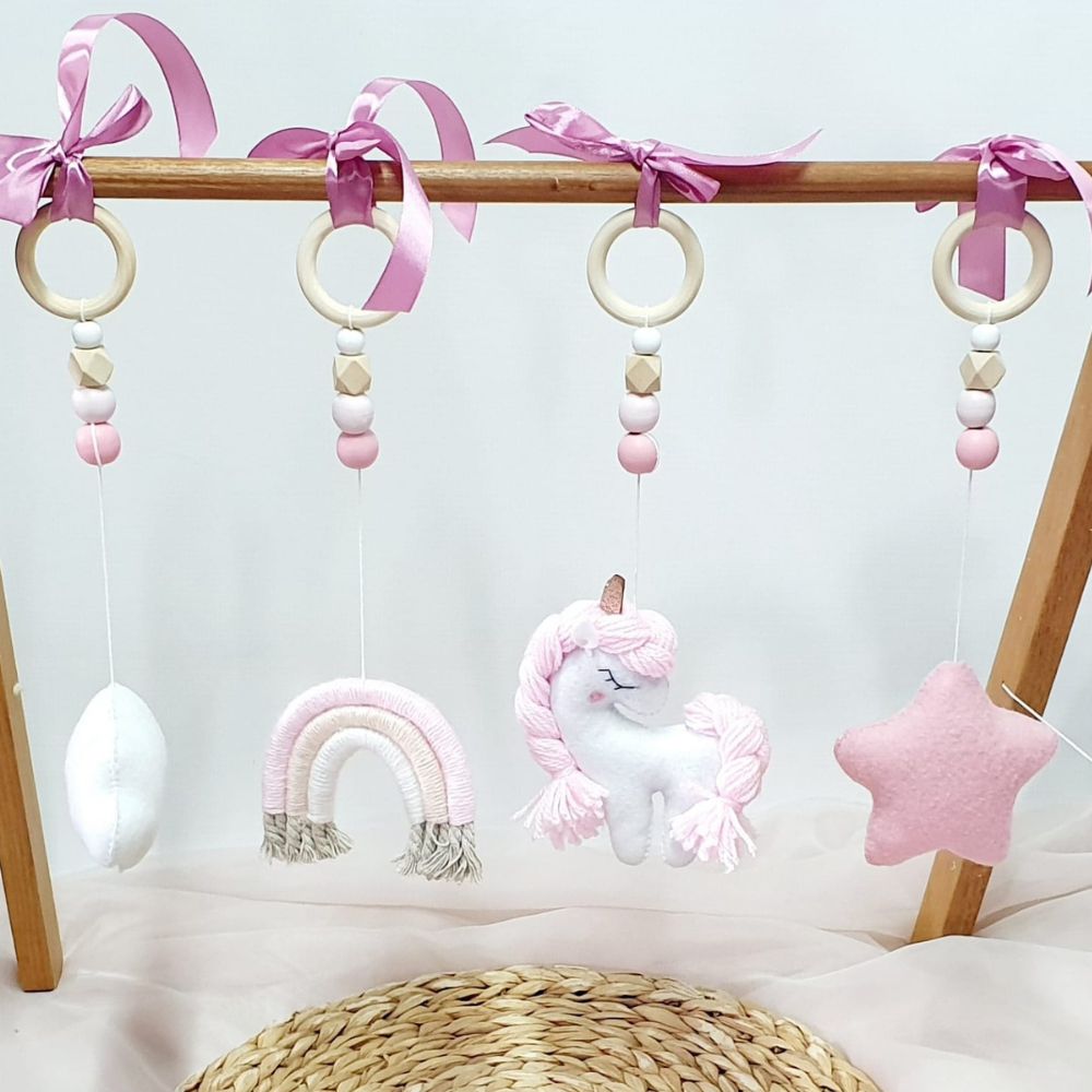 Play gym dangle set made out of handmade felt characters and all elements are firmly fixed with a thread to a Uncoated Wooden Ring.