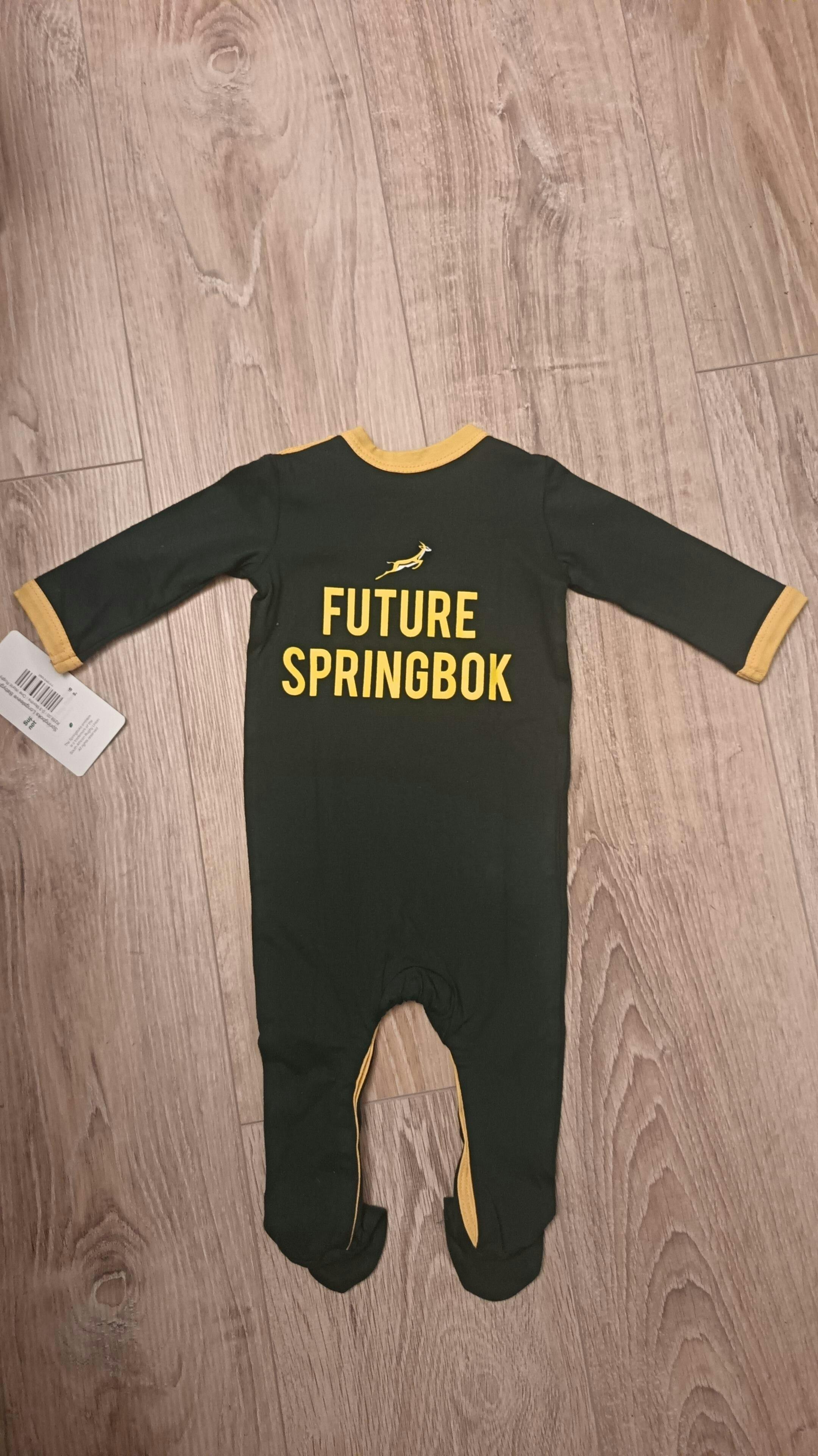 Get your little one ready to rumble with this adorable Springboks Long-Sleeve Babygrow! Made from super-soft, breathable cotton, it's perfect for keeping your future rugby star comfy and cosy. Featuring the iconic Springbok emblem, your baby will be cheering "Go Boks!" from the crib. It's easy to snap on and off for quick changes, so you won't miss a minute of game time (or nap time!). Perfect for match day, everyday wear, or gifting to the newest Springbok fan in your life!