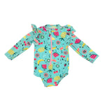 The kids' swimsuits are made from printed matte lycra, lined with trilobal for an extra layer of heat, and feature a zip in the front for easy on and off. At the bottom of the swimsuit, there are press studs to facilitate easier nappy changing. The swimsuits are made with long sleeves to protect your little one’s skin a little more from the sun. Lycra also offers excellent UV protection.