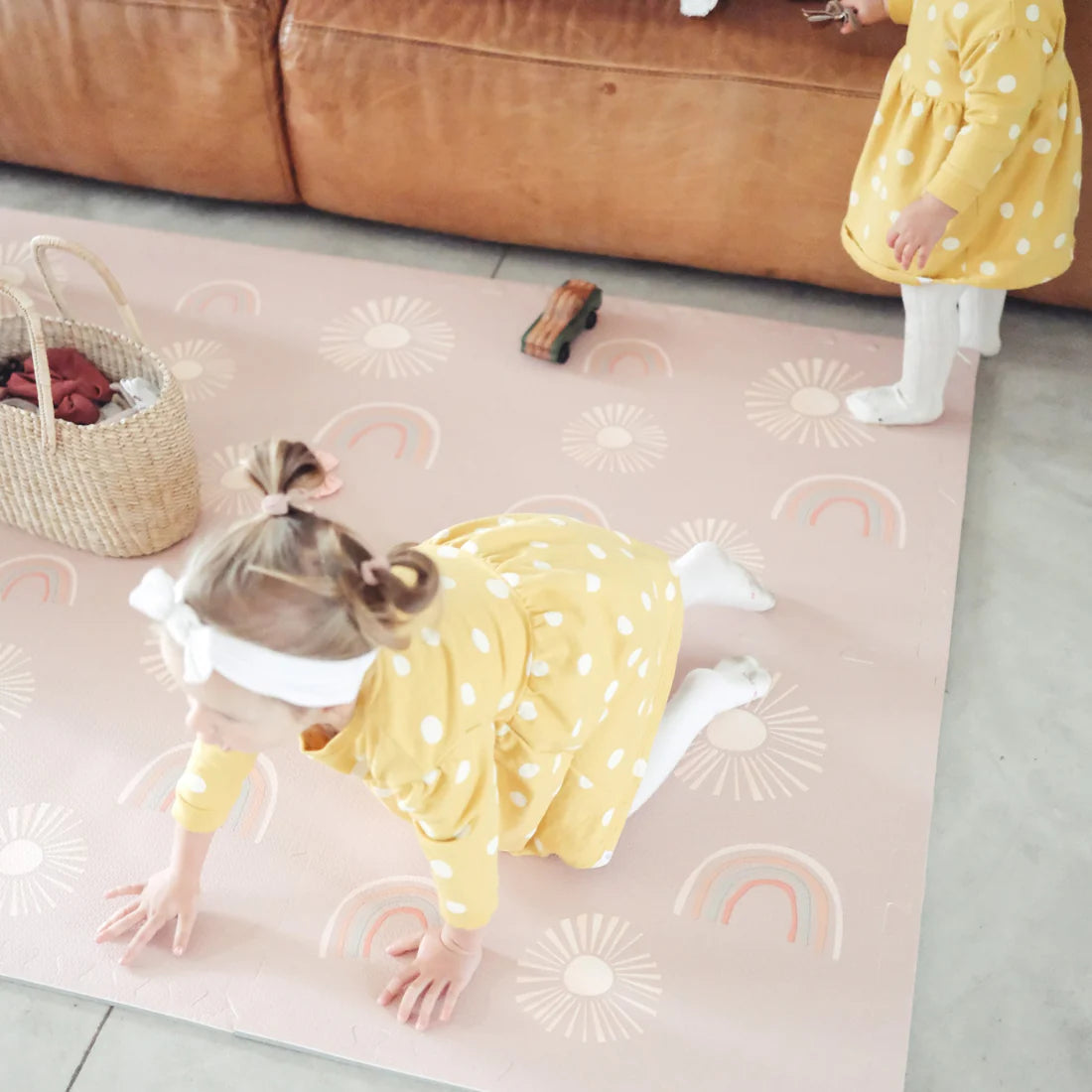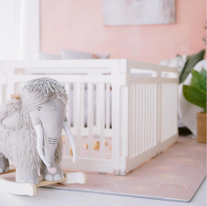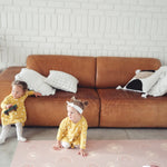 This exclusive Rainbow Rise  in a pink clay colour, is the perfect playmat for subtle boho or natural looks. Natural, earth pink tones bring to life the sophisticated rainbow and subtle sun designs, inviting endless hours of creative exploration. Let their imaginations run wild with this luxurious and playful addition to your little ones room.