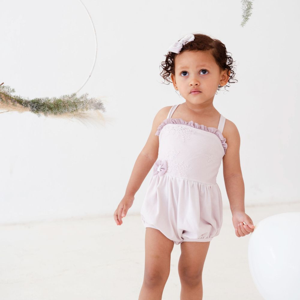Like a pretty daydream, this romper features a fun bubble-cut design, a lace-covered bodice, a cute mesh bow with an adorable mesh frill, and adjustable straps for longevity. Snap button fastening for ease of diaper change.