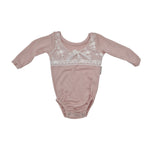 Long-sleeved pink cotton lycra leotard with lined lace detail. This leotard is very stylish with a neckline that can be adjusted with a soft mesh string.