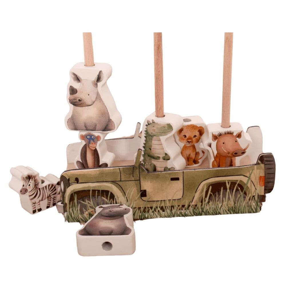 The Safari vehicle-inspired stand creates the feel of being in the African landscape with all the animals playing with each other as they take the journey through the bush.