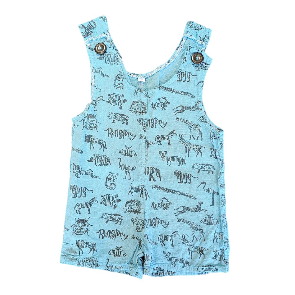 Let your little one explore in style with the Meelbroeke® Kids Bosbroek Short Dungaree. This charming one-piece is the ultimate outfit for young adventurers, featuring a playful and educational "Bosbroek" (Bush Pants) print inspired by the South African bushveld. The soft sage green fabric is covered in a delightful pattern of various African animals, each accompanied by its name in Afrikaans, from the "Tier" (tiger/leopard) to the "Olifant" (elephant).