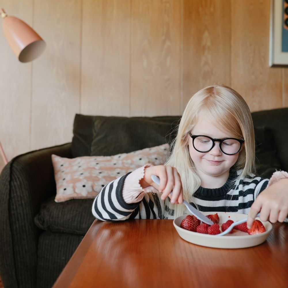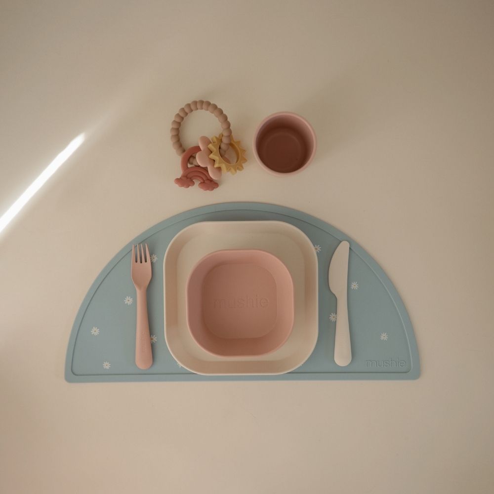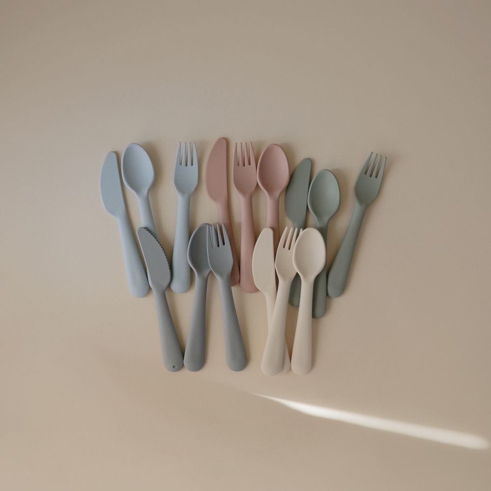 A stylish and practical pp-plastic cutlery set from Mushie, designed with little ones in mind.