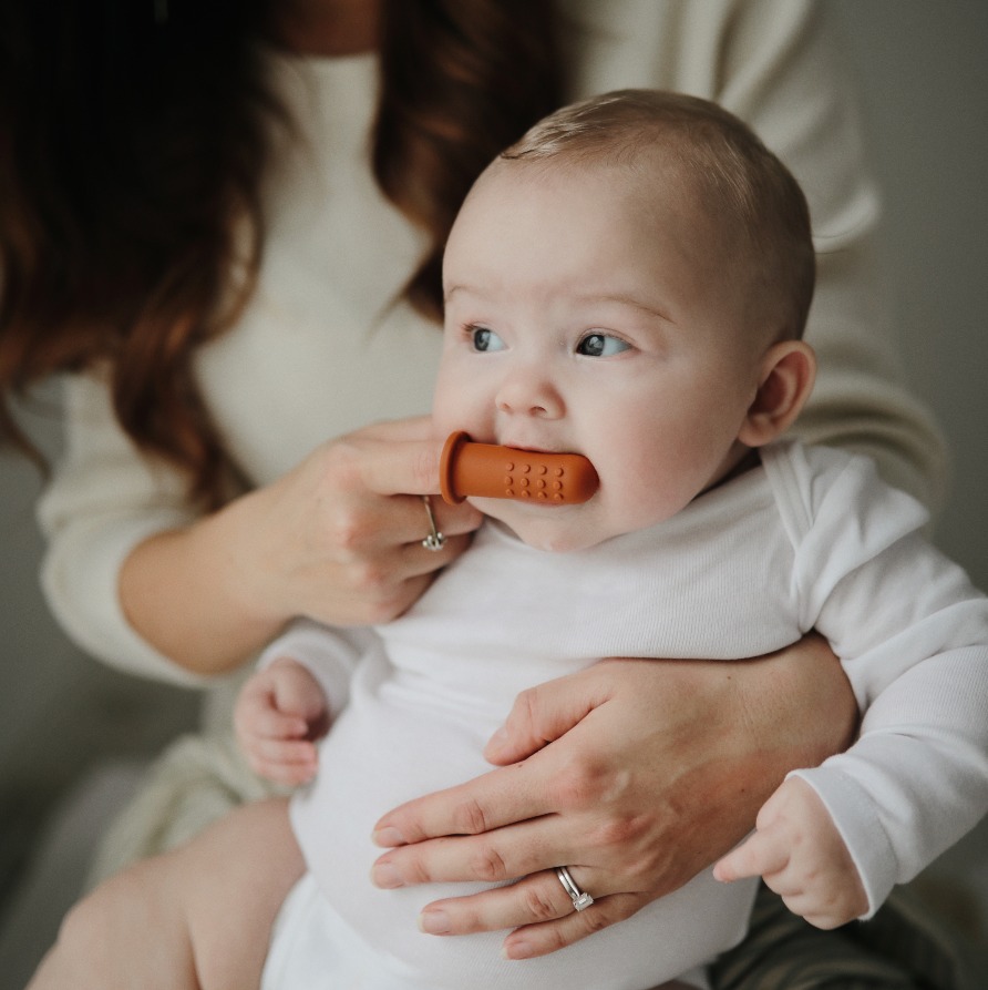 Brush bacteria away from your baby’s gums with a finger toothbrush from Mushie!