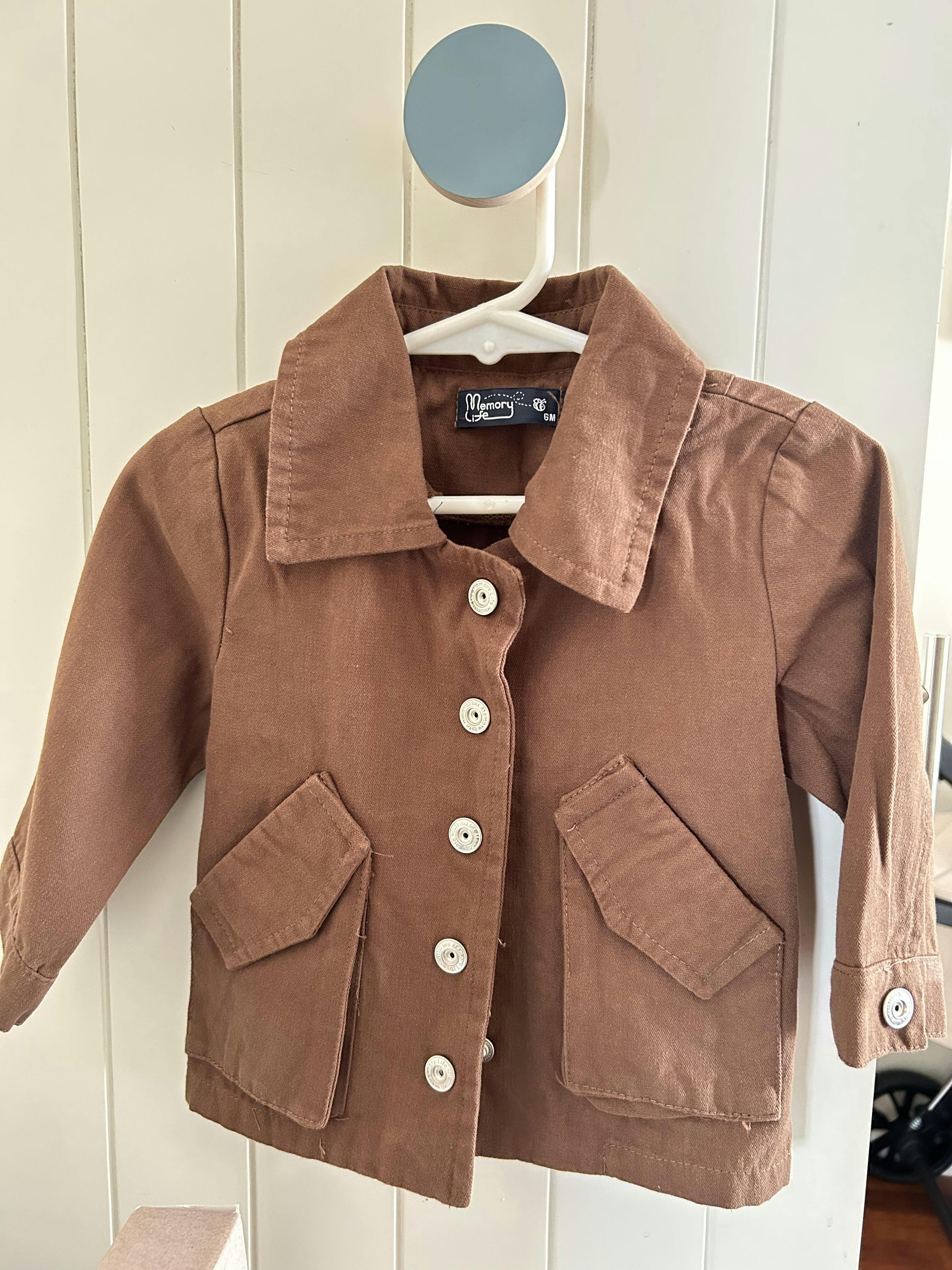 This adorable little jacket, made from a soft yet durable denim-like fabric, is the perfect touch of cool for your toddler! Featuring a sweet collar and easy-to-fasten buttons down the front, getting dressed is a breeze. The two little pockets on the chest add a touch of charm, just right for peeking into. Available in the cutest shades of khaki, light brown, rich dark brown, and a lovely deep green, this jacket is a versatile layer that will make your little one look extra cute on all their adventures. It's not just a jacket; it's a sprinkle of style for your tiny explorer!