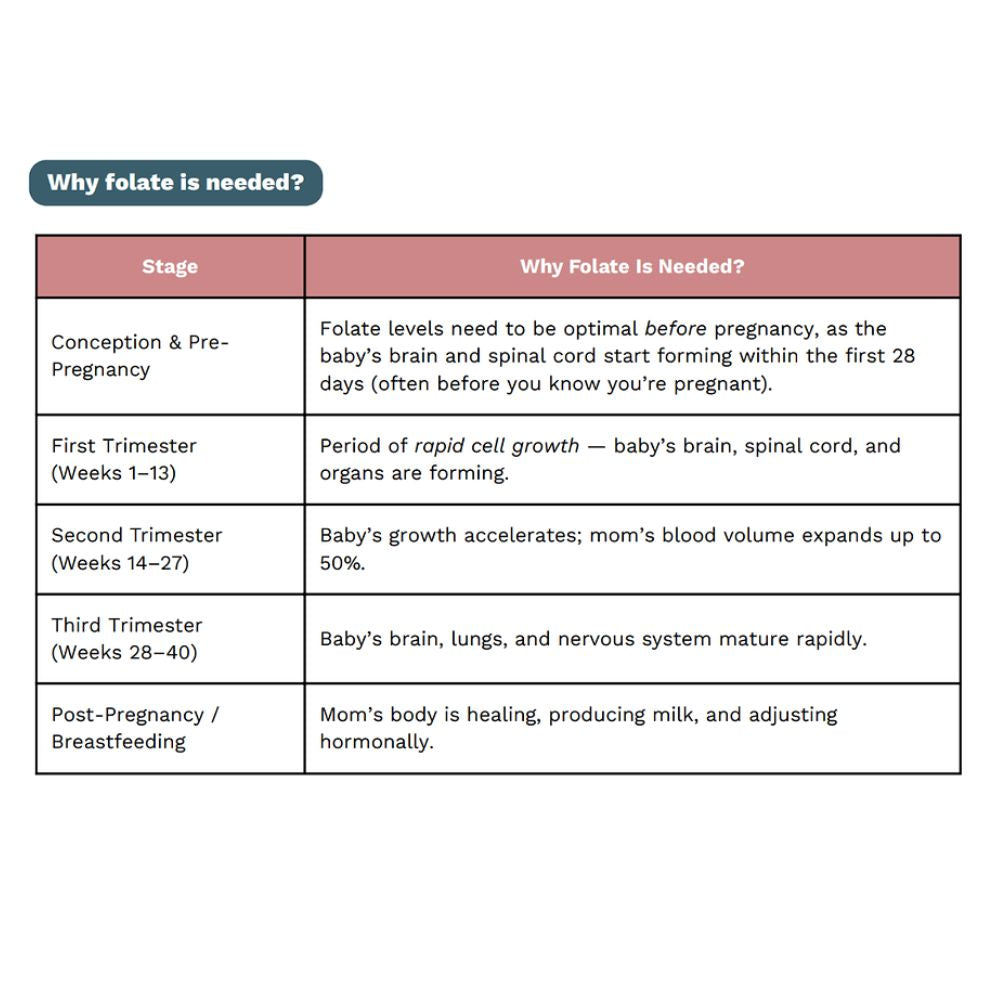Protects your baby’s development: Adequate folate before and during pregnancy supports healthy brain and spinal cord development and reduces the risk of congenital defects.