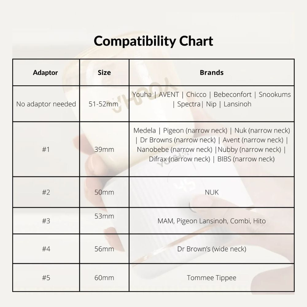 • No Adapter Needed: Medela | Pigeon (narrow neck) | Nuk (narrow neck) | Dr Browns (narrow neck) | Avent (narrow neck) | Nanobebe (narrow neck) |Nubby (narrow neck) | Difrax (narrow neck) | BIBS (narrow neck)