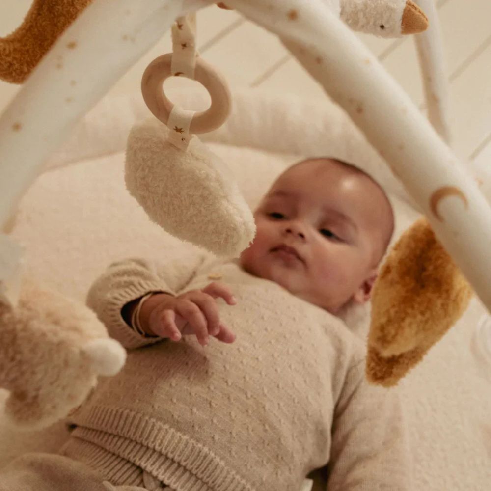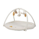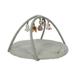 So much to see, feel and hear! Every day is a new adventure with this flower-shaped play mat. The pink mat has two large corduroy arches with five different cuddly toys from the Friends collection hanging from them.