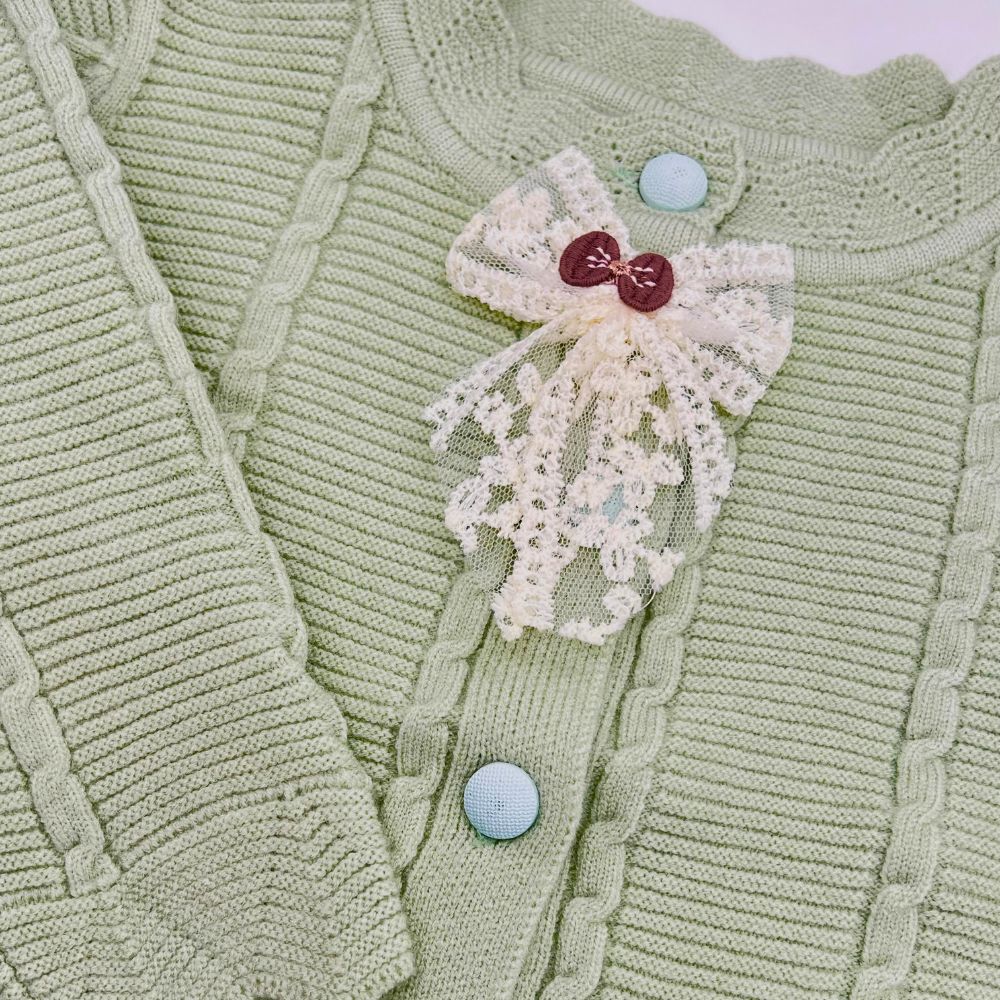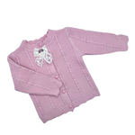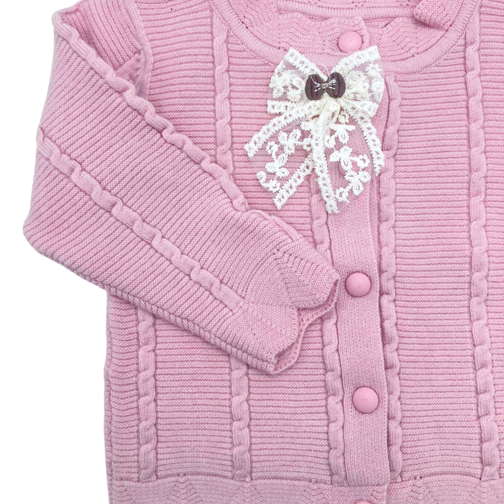 This darling knit sweater adds a touch of delicate sweetness to any little one's outfit. Crafted in a soft and gentle knit, this sweater will keep your little one snug and comfortable all day long. The subtle, pastle hues exudes a gentle charm, while the delicate lace and bow detail adds a touch of vintage-inspired elegance. Featuring a classic round neckline and a practical button-down front, finished with sweet buttons, this sweater is both easy to wear and irresistibly cute. The intricate knit pattern adds a touch of texture and sophistication. Perfect for layering over tops and dresses, this sweater is a delightful addition to any baby's or toddler's wardrobe, bringing a smile to everyone who sees it.