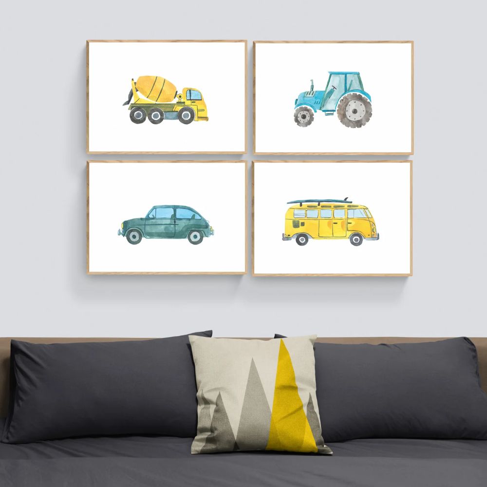 Bring a pop of colour and imagination to your child's room with this collection of blue and yellow vehicle art prints. Perfect for inspiring creativity and adding a touch of whimsy, this illustration will make a statement in any space. Let your child's imagination run wild with this playful addition to their decor!