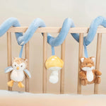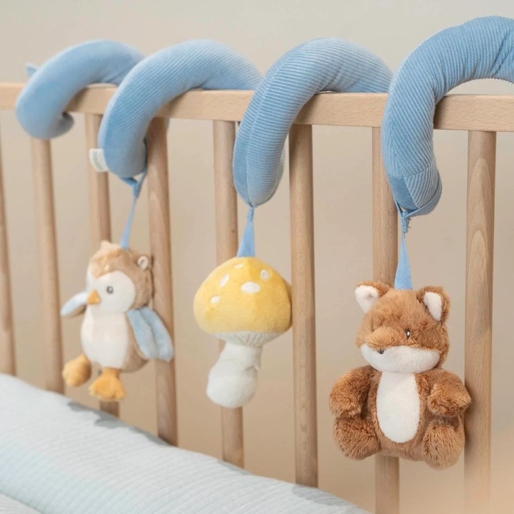 Look, feel and discover! This fun and entertaining activity spiral will keep babies busy at home and on the go. Easily attach this practical toy to anything from a crib to a playpen. It will enhance the senses and encourage hand-eye coordination. Made from corduroy and cotton, the activity spiral revolves around a little fox, a toadstool and an owl.