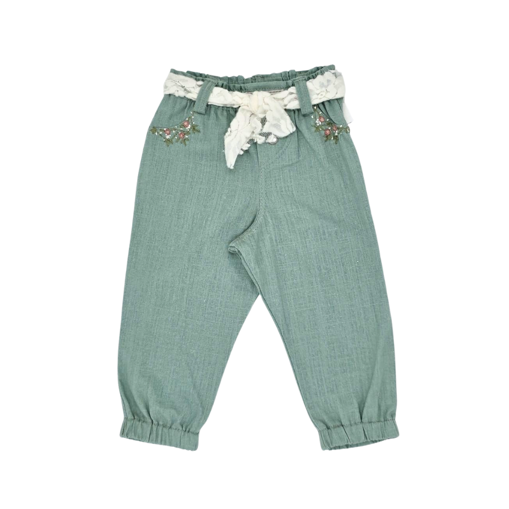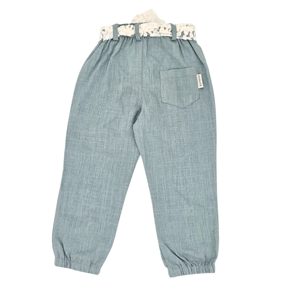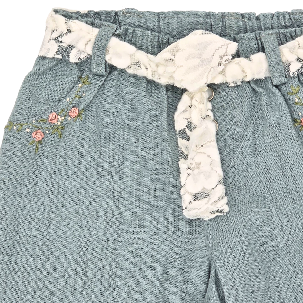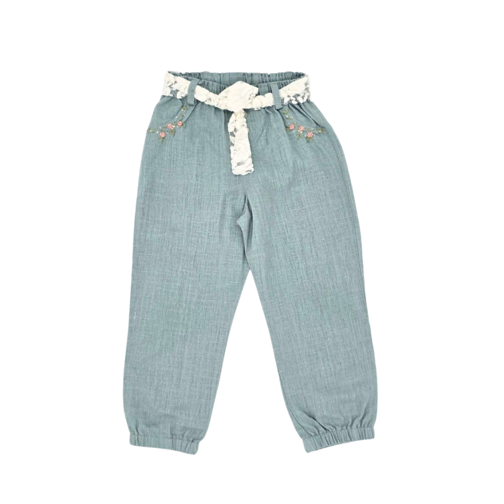 The denim spandex fabric is very flexible and has a soft touch. Stylish pants with elastic around the waist. Cute lace belt in front. Hand-embroidered roses and daisies on the faux pockets to give that elegant vintage look. The lace band can be removed. It is kept in place with two tabs in front and three tabs at the back.