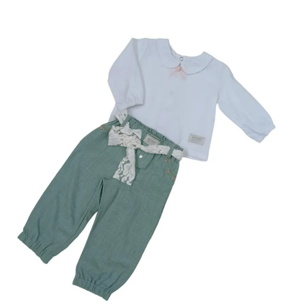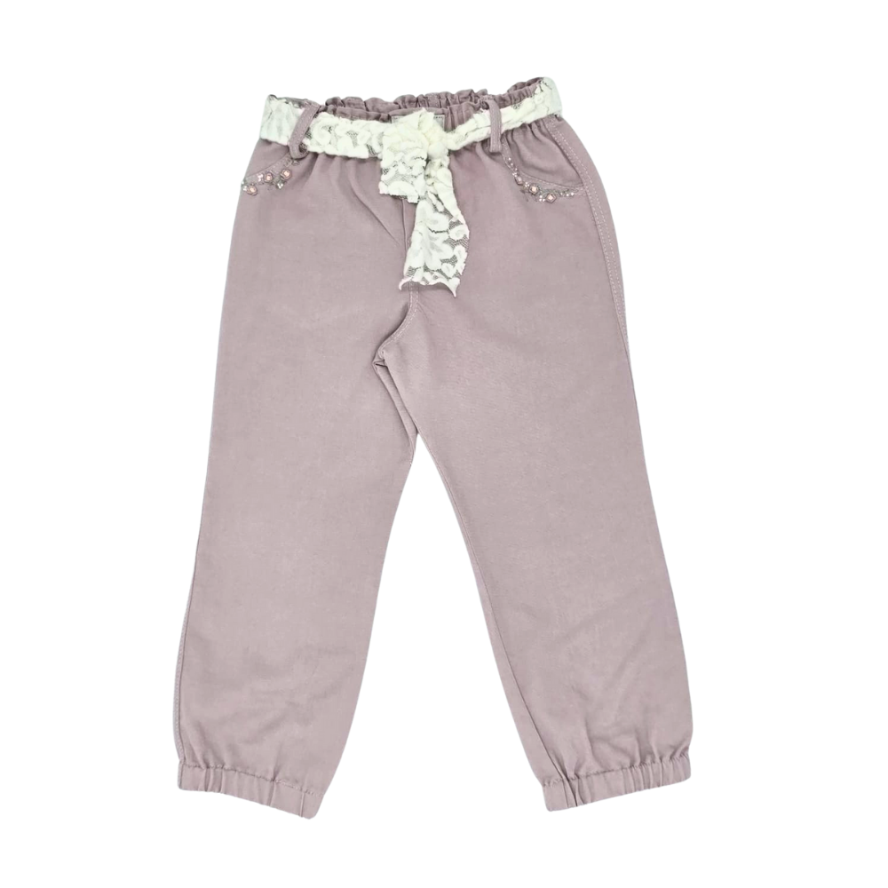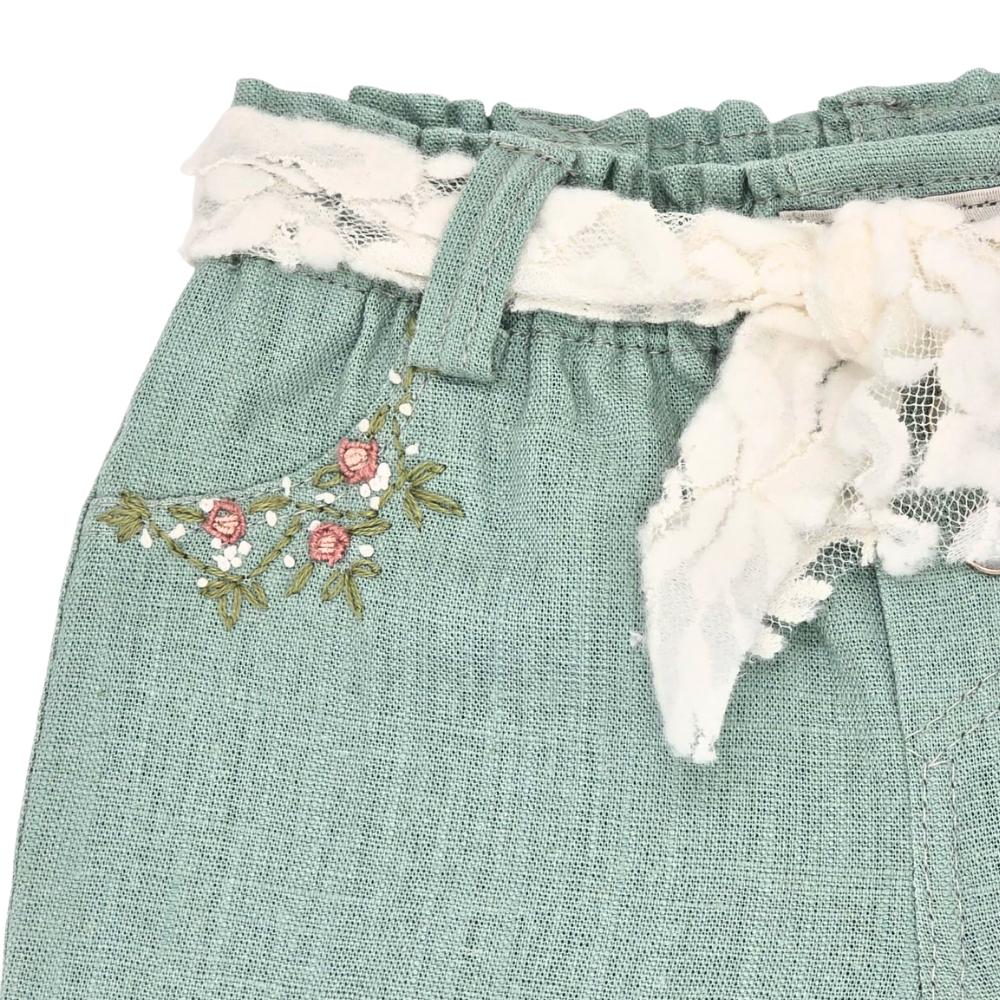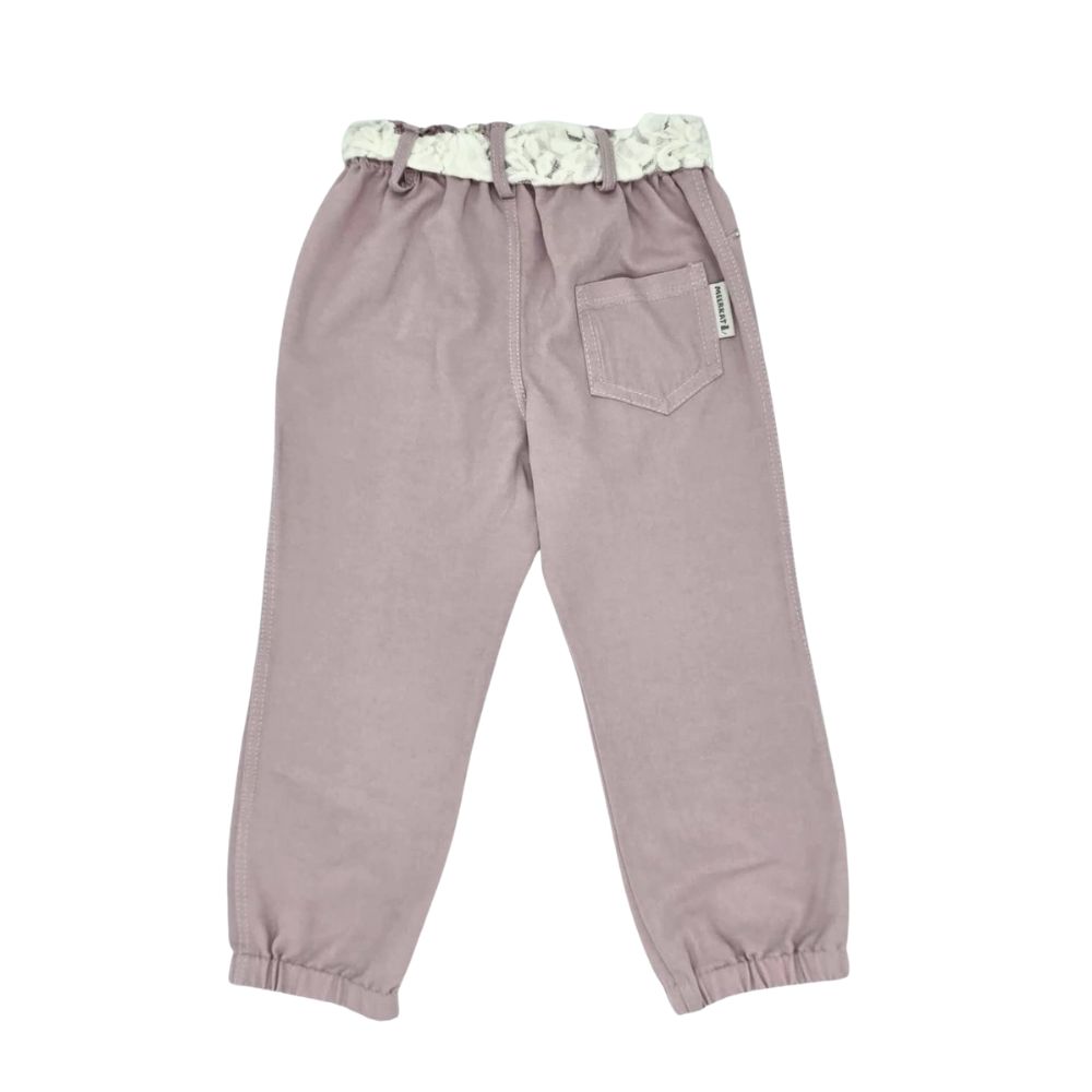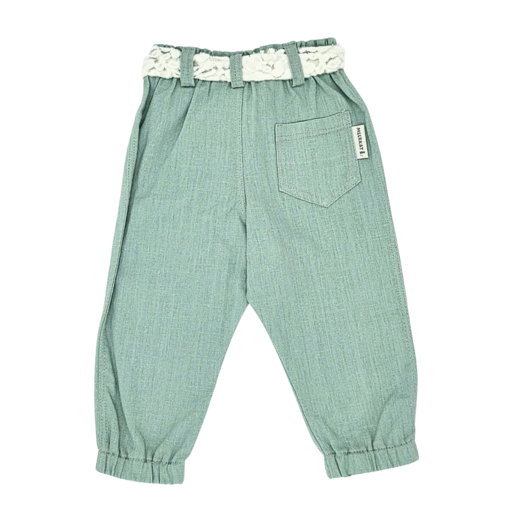 The denim spandex fabric is very flexible and has a soft touch. Stylish pants with elastic around the waist. Cute lace belt in front. Hand-embroidered roses and daisies on the faux pockets to give that elegant vintage look. The lace band can be removed. It is kept in place with two tabs in front and three tabs at the back.