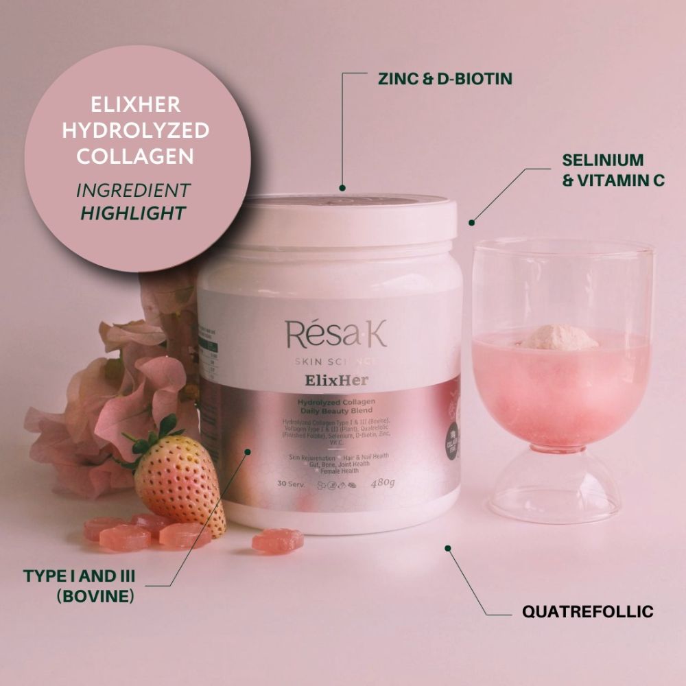 ElixHer is expertly formulated to address the prominent concerns of feminine beauty and physical health. With collagen decreasing from the age of 18, and a yearly loss of 1% after 40 years of age, supplementing with Collagen is essential. Collagen is integral in maintaining optimum hydration levels in the skin, which promotes elasticity and supports essential cellular processes.